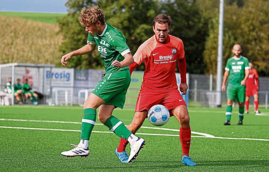 Eine klare Sache war in der Fußball-Kreisliga A am Sonntag das Spitzenspiel zwischen der SSV Brensbach (recht der Torschütze zum 1:0, Daniel Beck, gegen Nick Friedrich) und dem FV Mümling-Grumbach Foto: Joaquim Ferreira